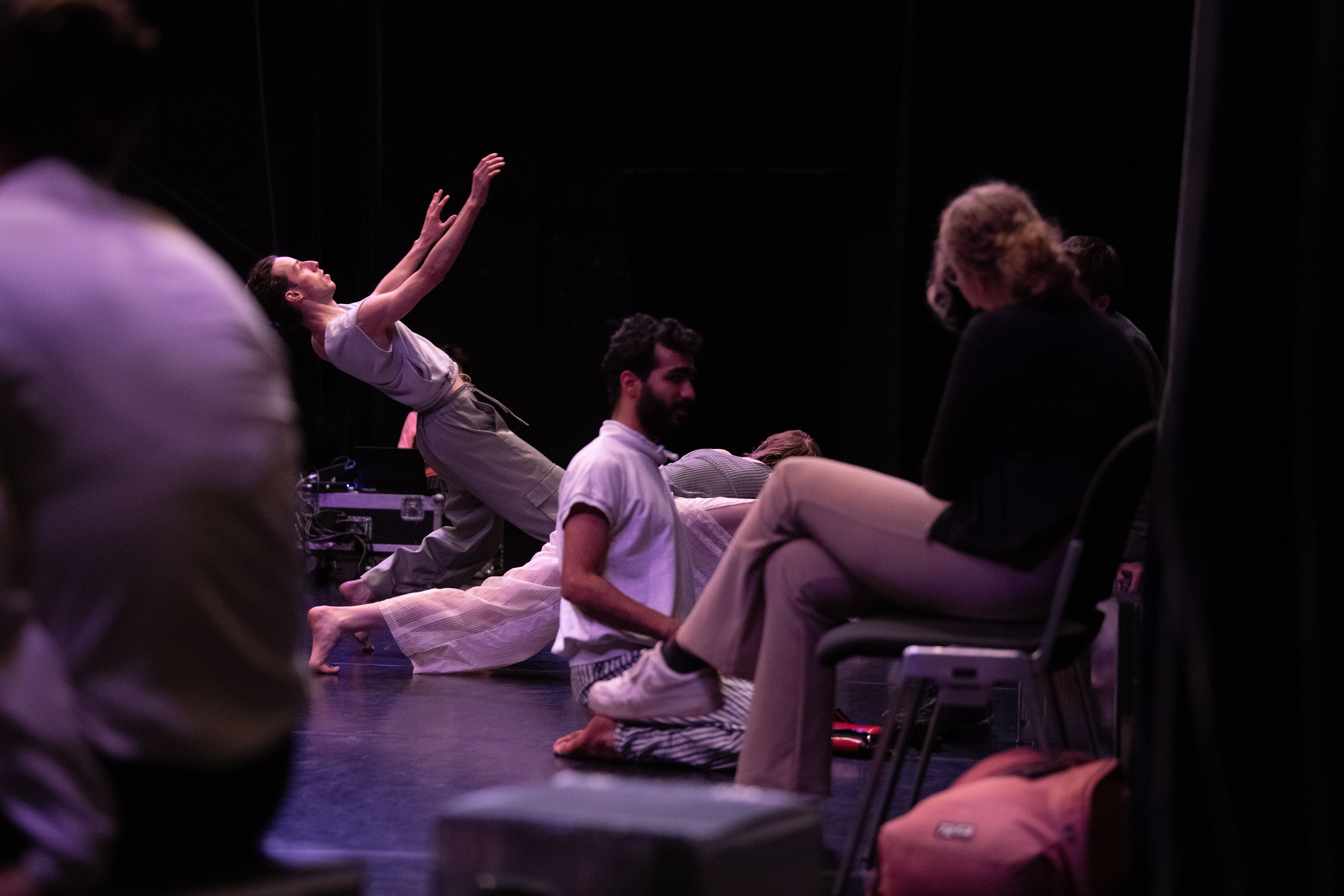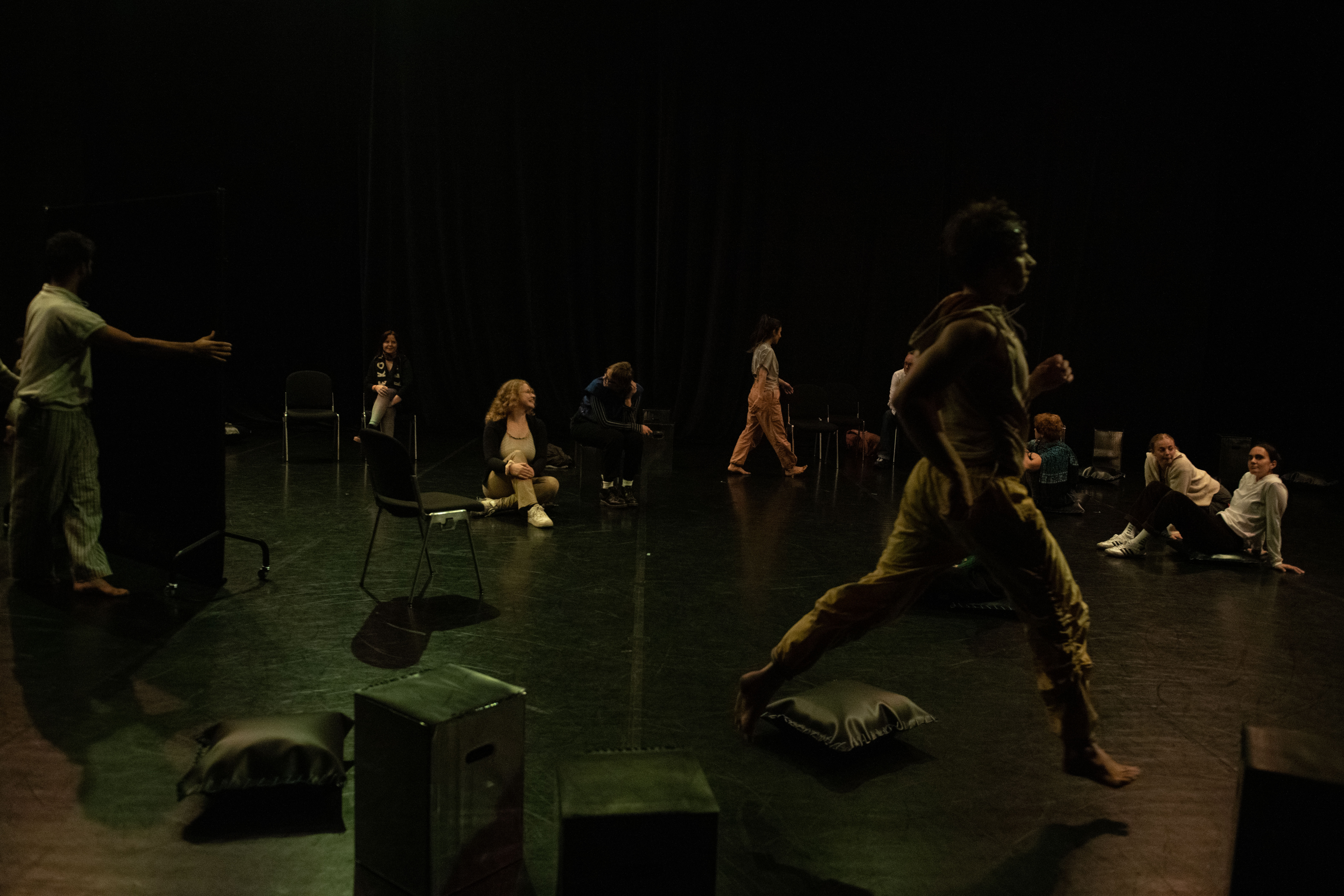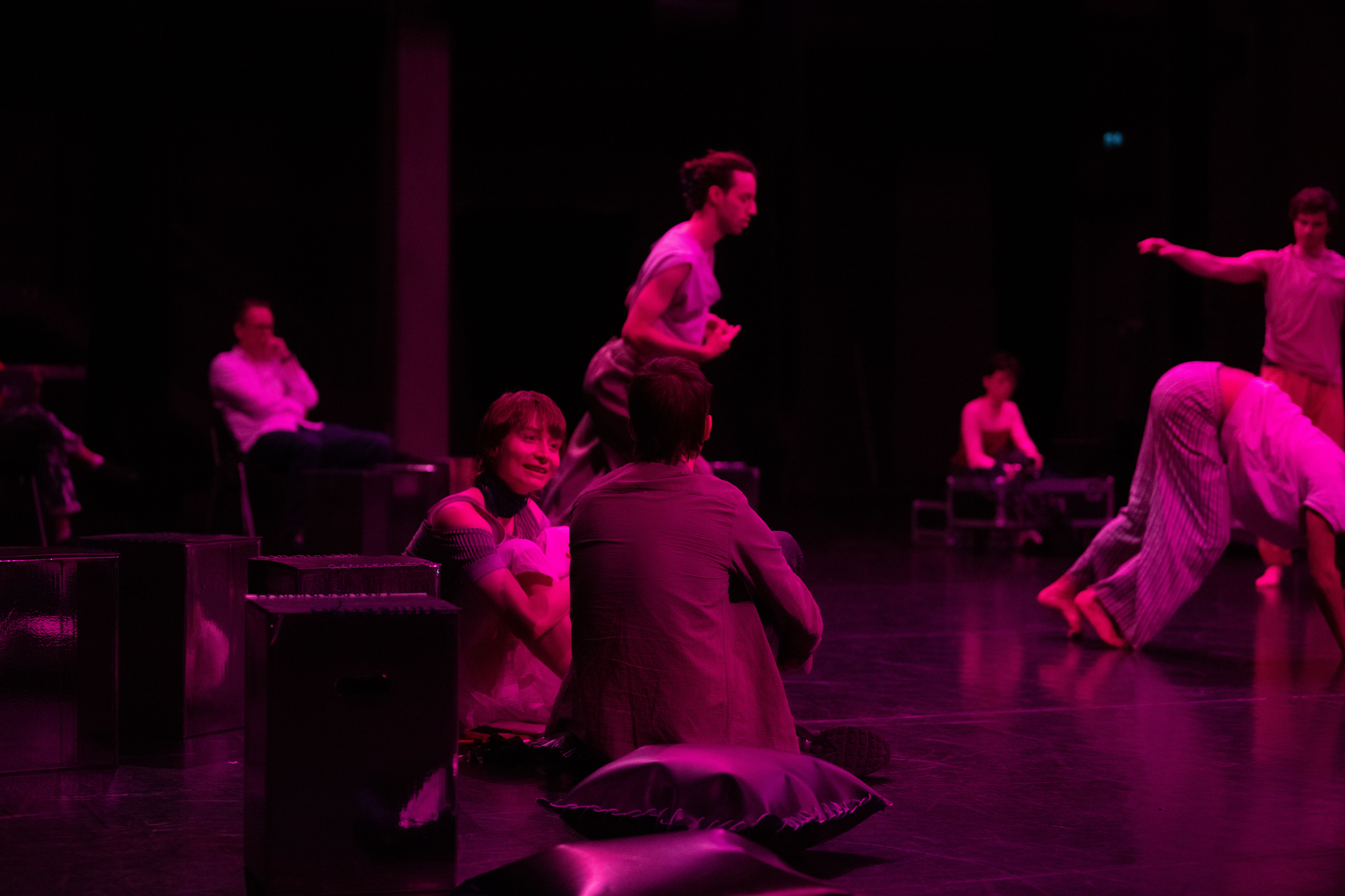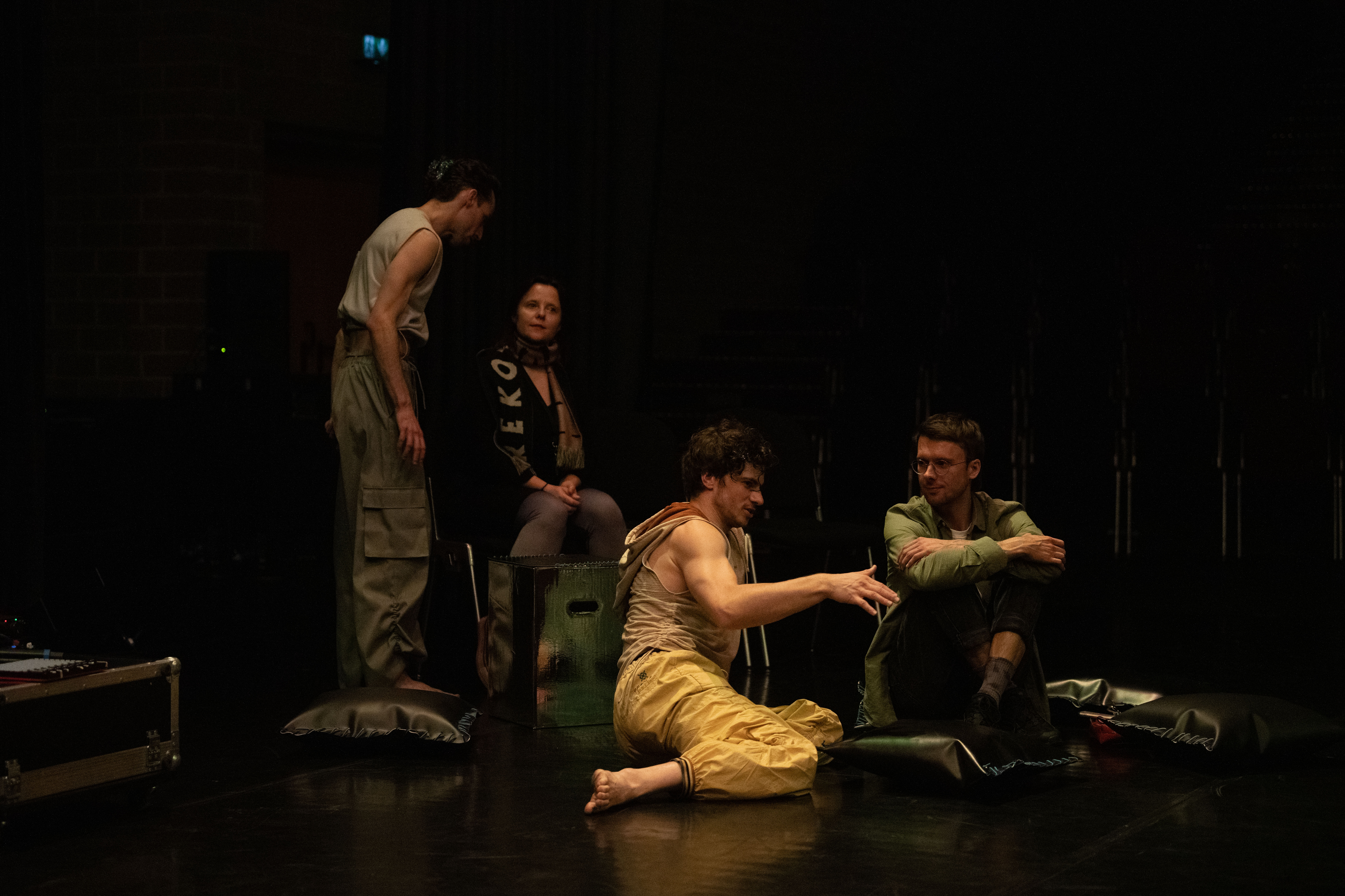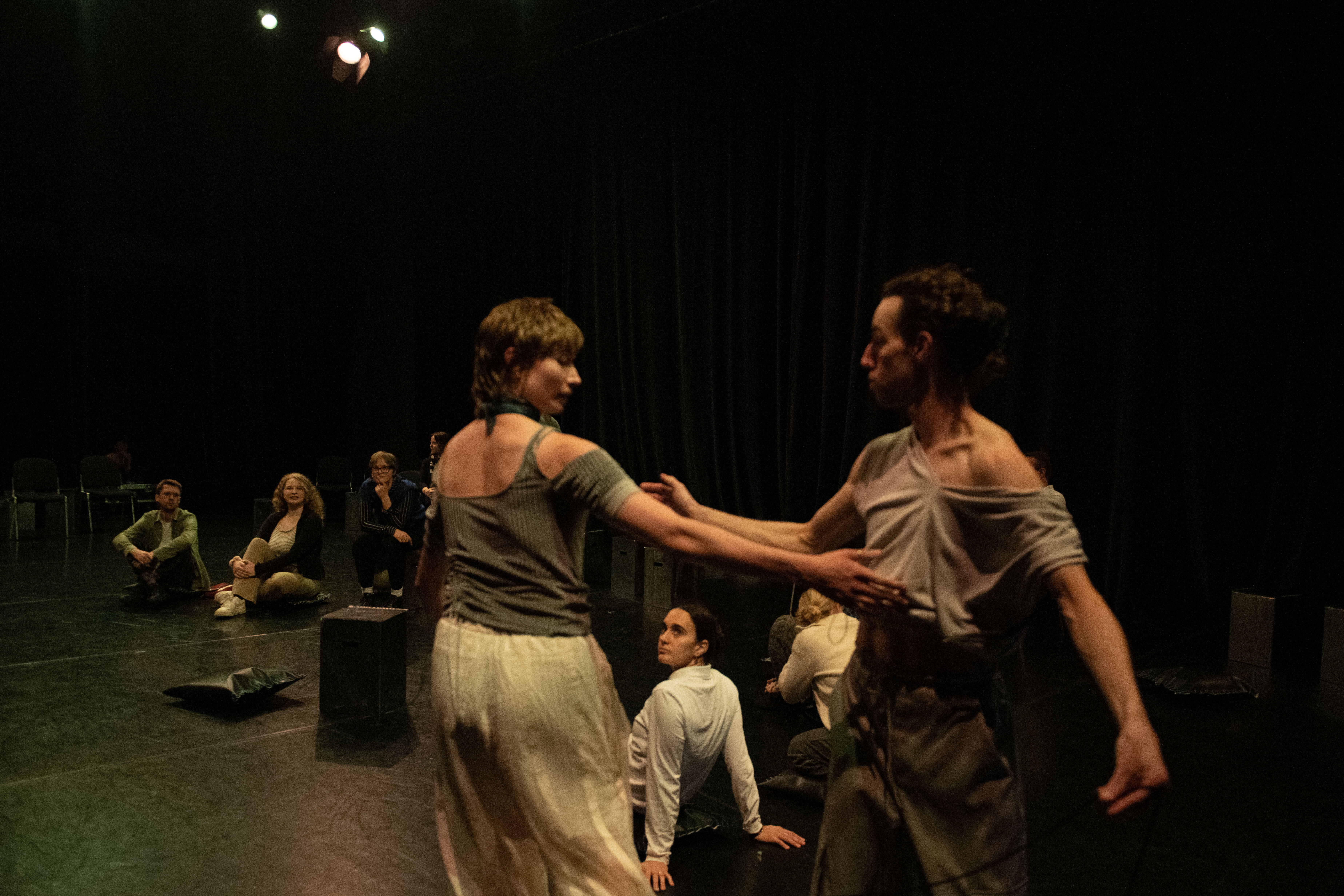 In NAH, the dancers continually approach the audience members scattered about the stage, sharing their movement motifs, choreographic processes and the emotions connected to this. Does this knowledge engender intimacy? The audience will also be enabled to keep changing the perspective in space. And the space, too, moves along and is part of the choreographic landscape that permanently transforms. This is about the attempt to shift the boundaries between audience and dancers while never completely dissolving them.