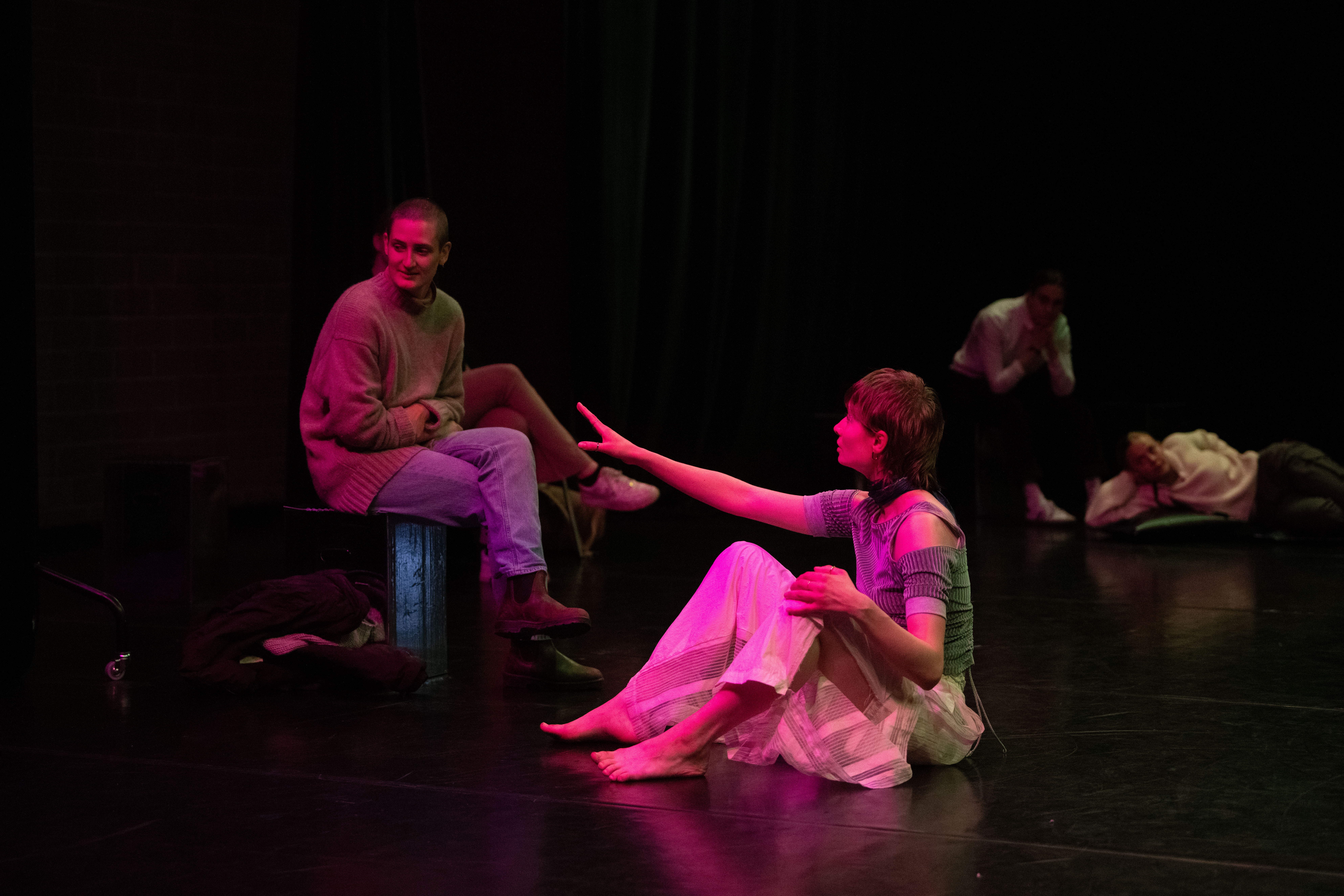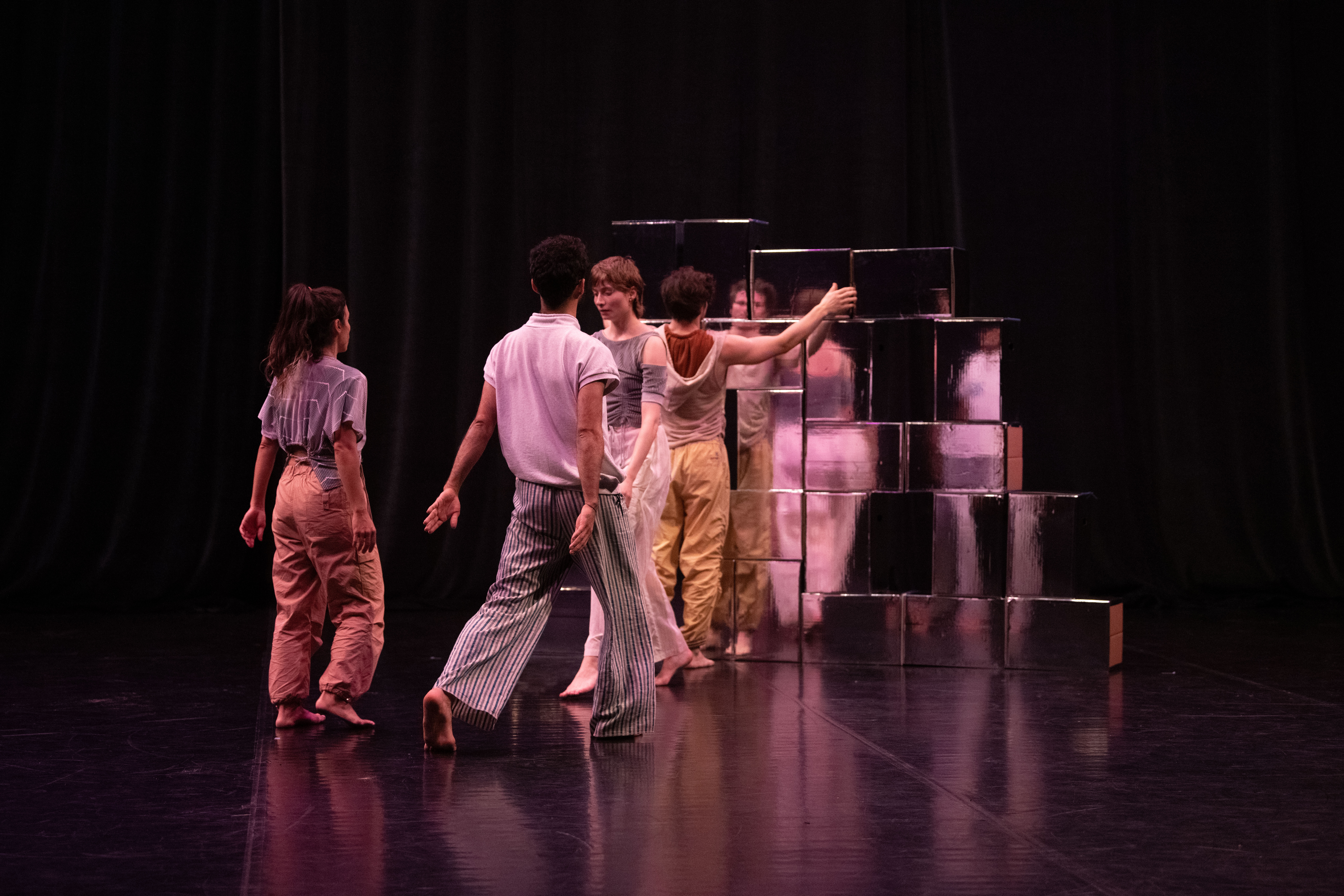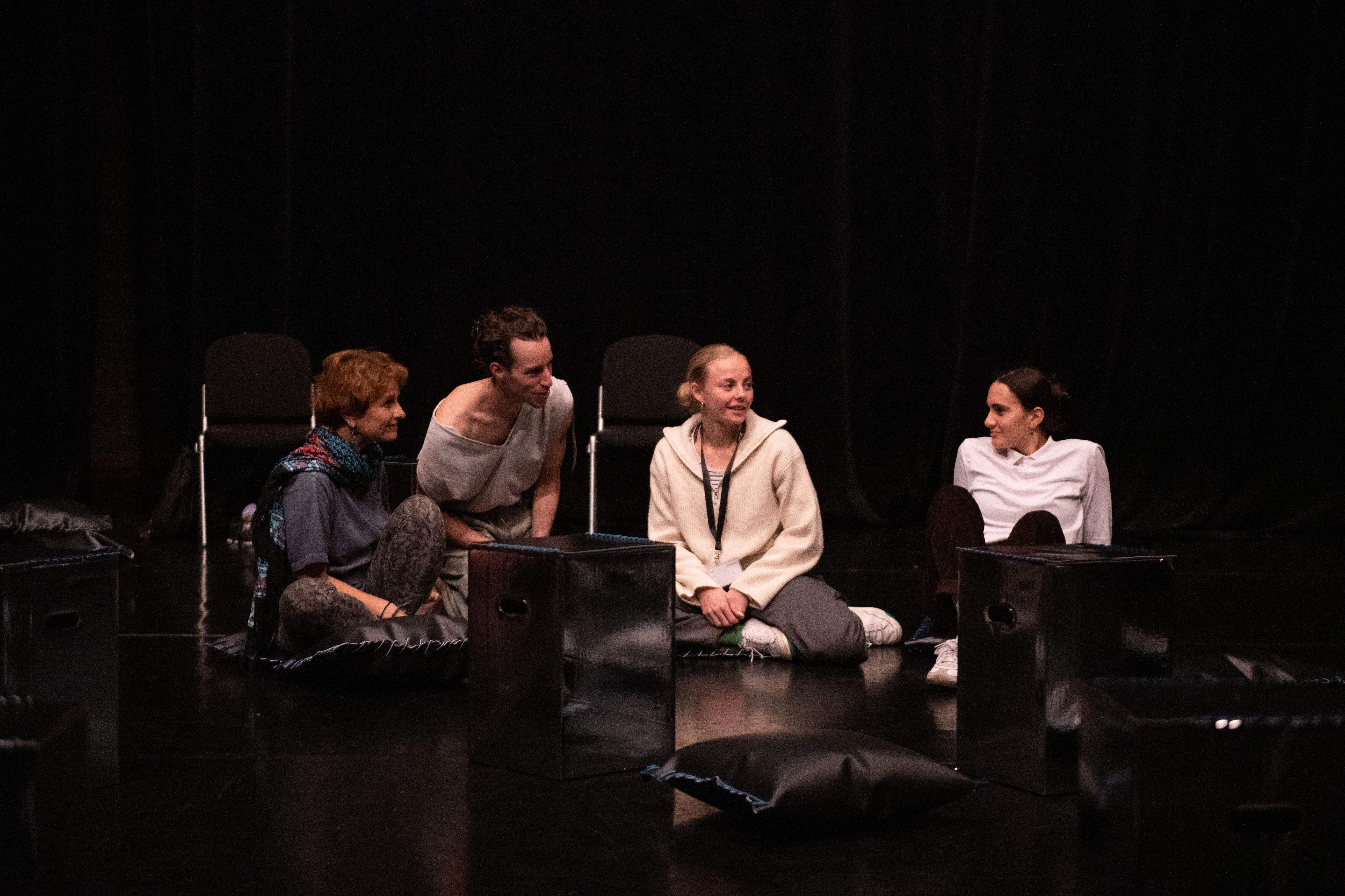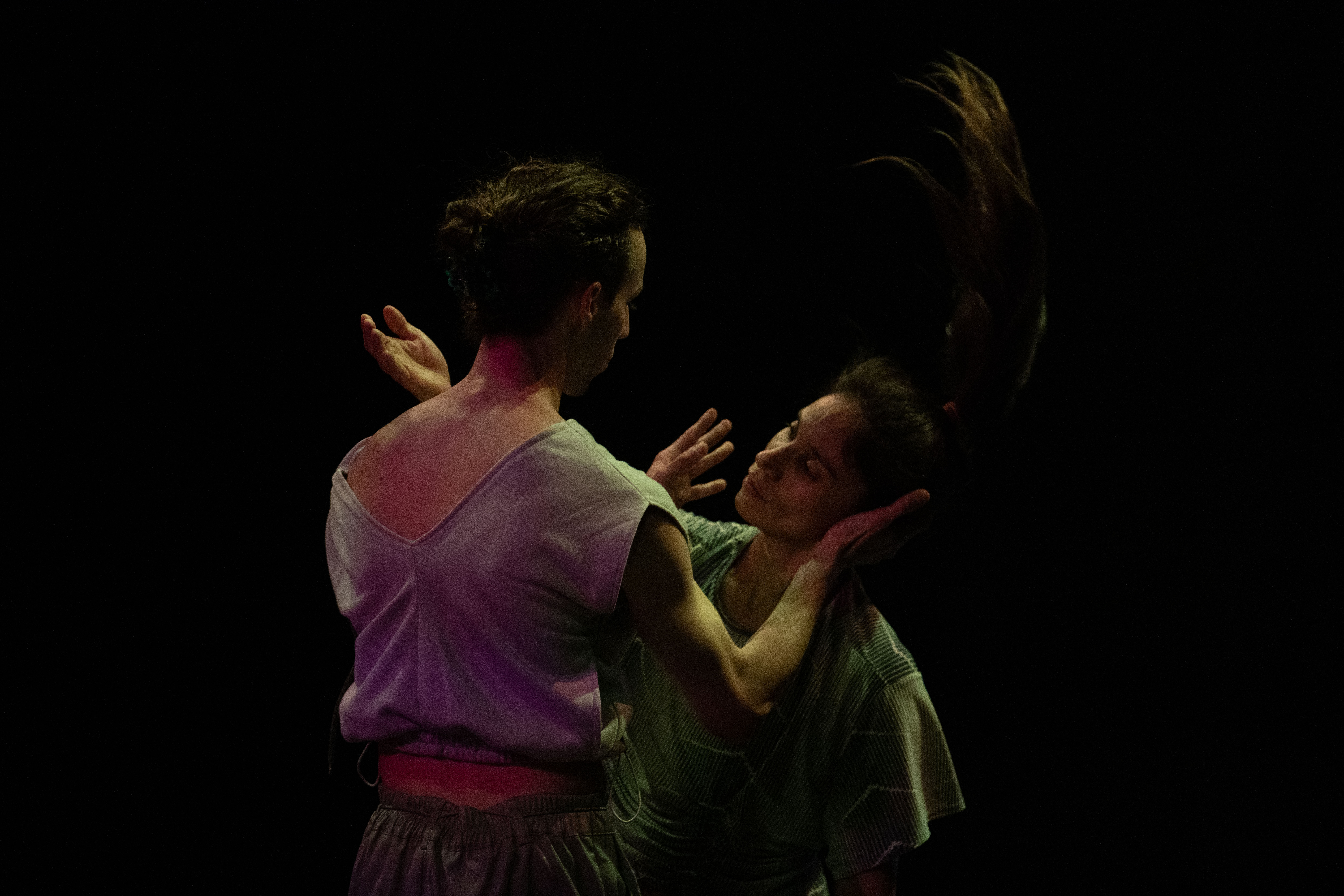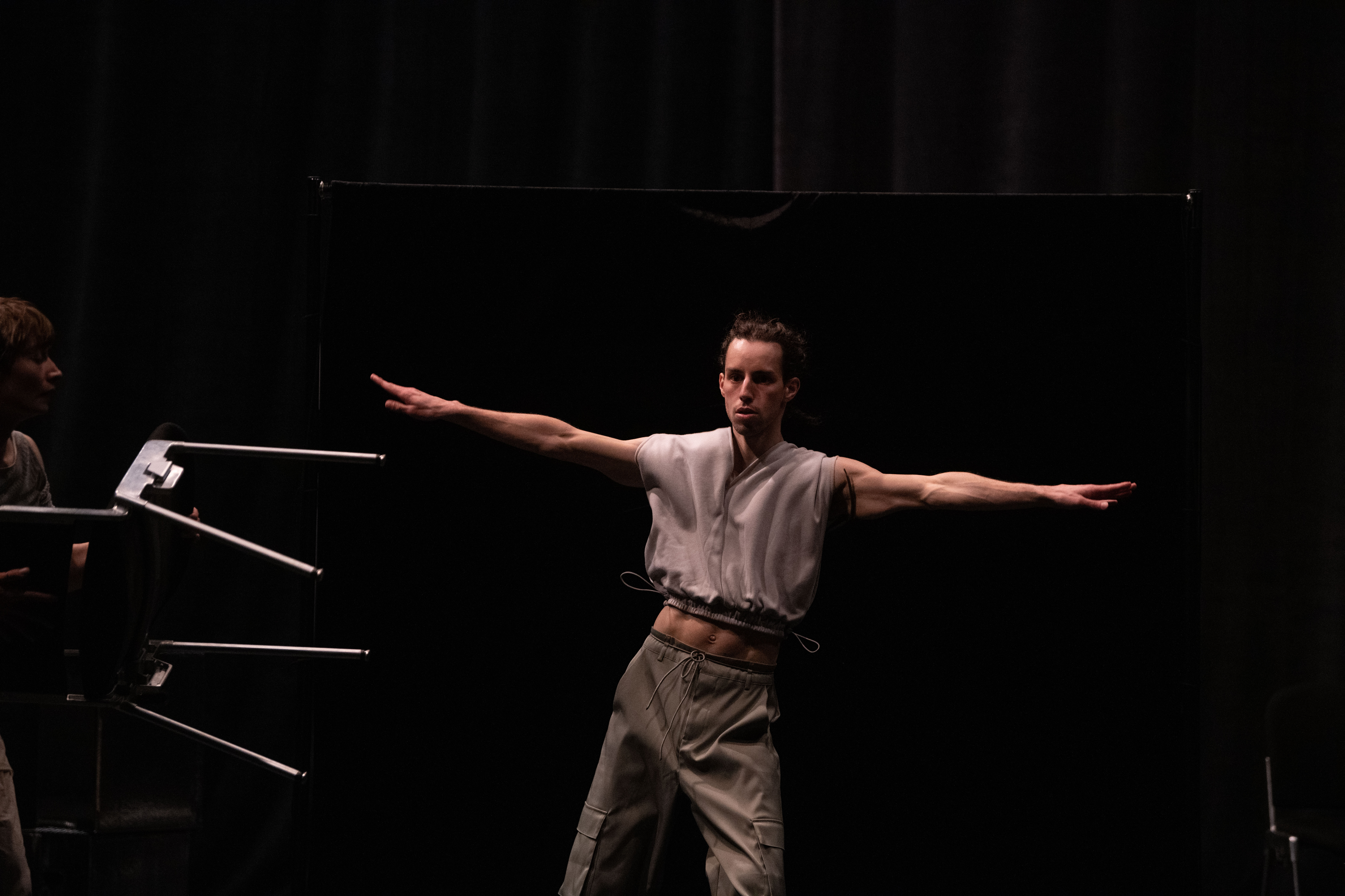 In NAH, the dancers continually approach the audience members scattered about the stage, sharing their movement motifs, choreographic processes and the emotions connected to this. Does this knowledge engender intimacy? The audience will also be enabled to keep changing the perspective in space. And the space, too, moves along and is part of the choreographic landscape that permanently transforms. This is about the attempt to shift the boundaries between audience and dancers while never completely dissolving them.