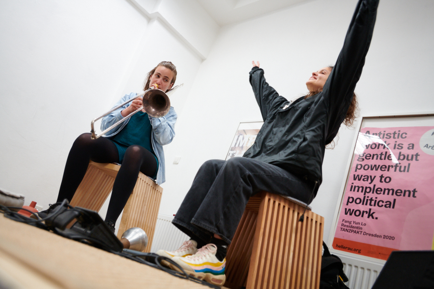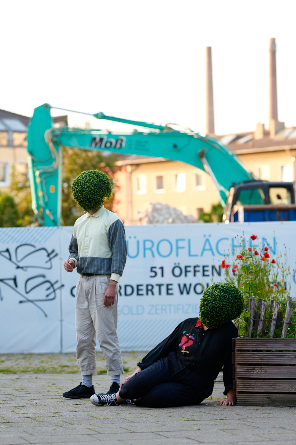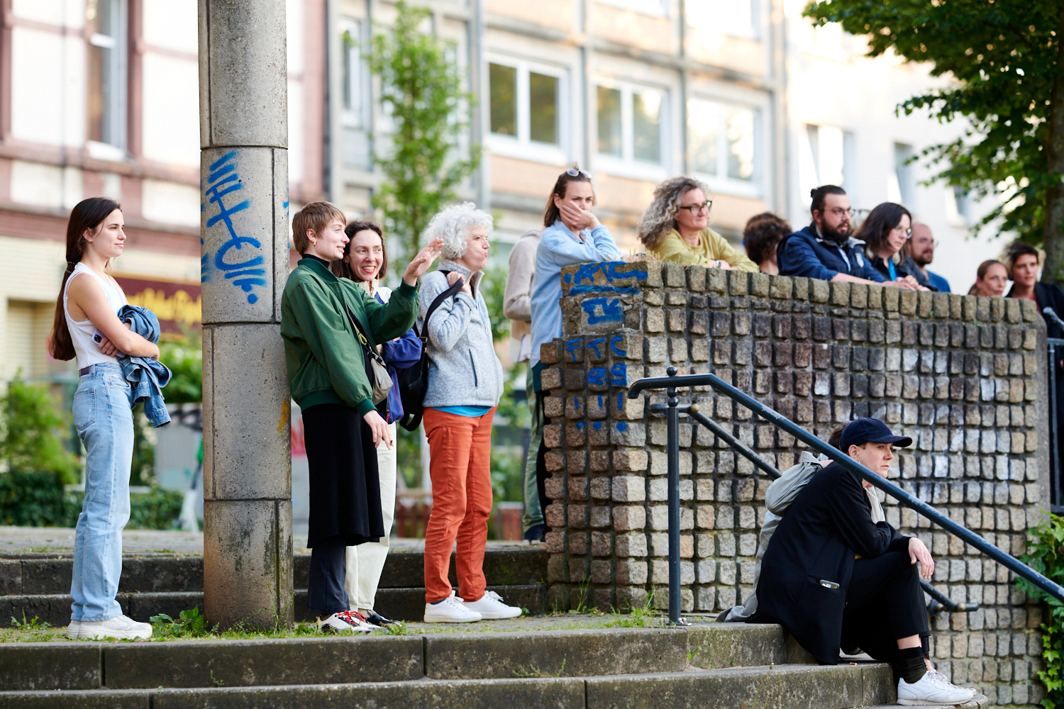 This led to an interesting discussion on the use of city centers. This was followed by a performative intervention by Johannes Karl and Patricia Bechtold from the äöü collective. With thoughts on the public and shared use of urban spaces, the performers took us out onto Weberplatz and performed parts of their latest work on the subject of the future in costume. The intertwining of their artistic intervention, the children playing on the square and a group of young people who were there, tied in well with the previous discussion. The evening was rounded off with an acoustic set by Maria Trautmann and Maika Küster from the band Wir hatten was mit Björn.
