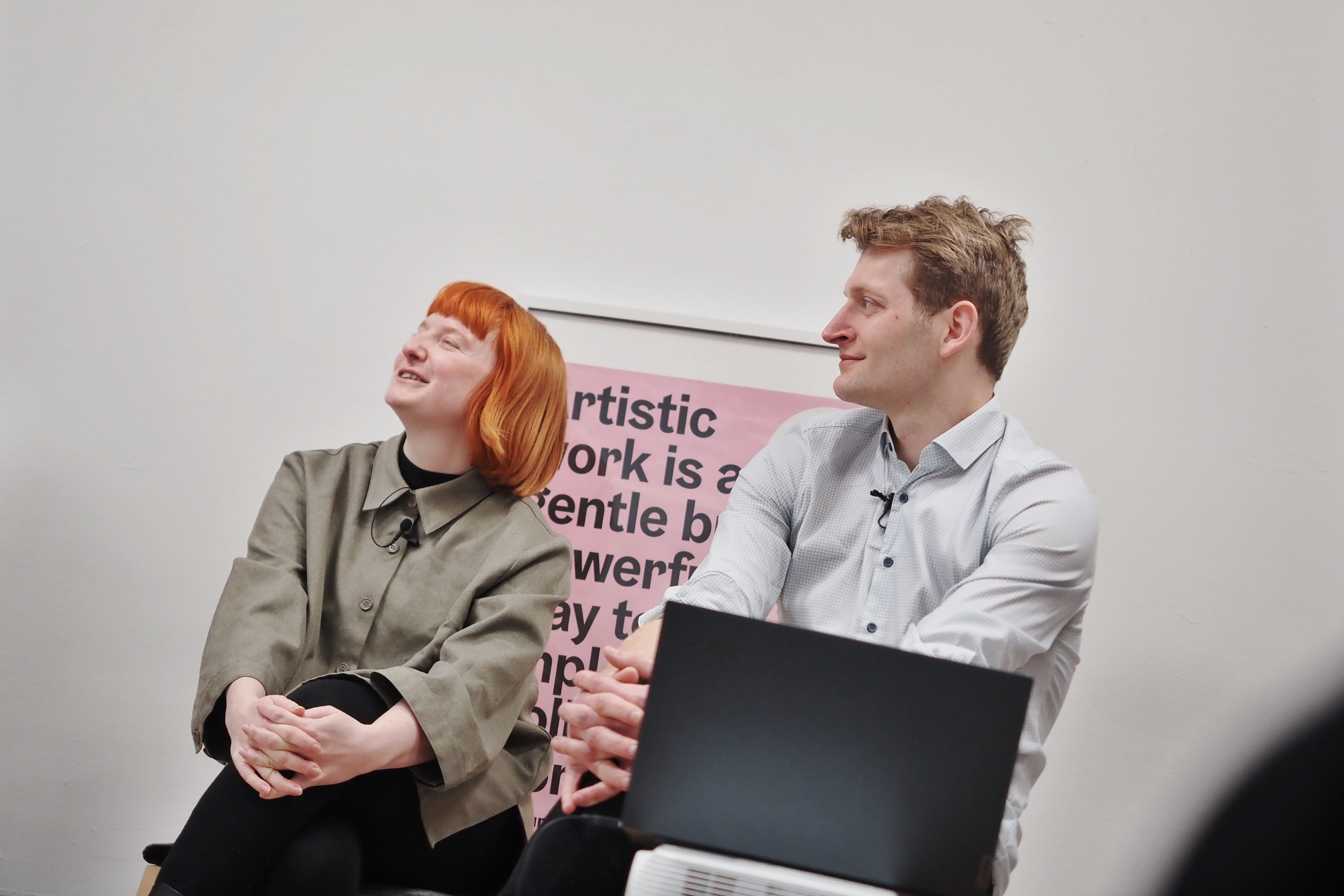 In the second event, we invited artist and PhD student Anne Küper and media artist Till Bödeker to talk about AI and the opportunities and difficulties of Chat GPT. After an introduction to the history of AI, both presented their artistic works that deal with or use AI. Like all other events, this one was moderated, but Chat GPT was also considered a discussion partner. In between, questions were put to the AI and the guests could decide for themselves whether they were satisfied with the answer and wanted to continue communicating with Chat GPT or not.